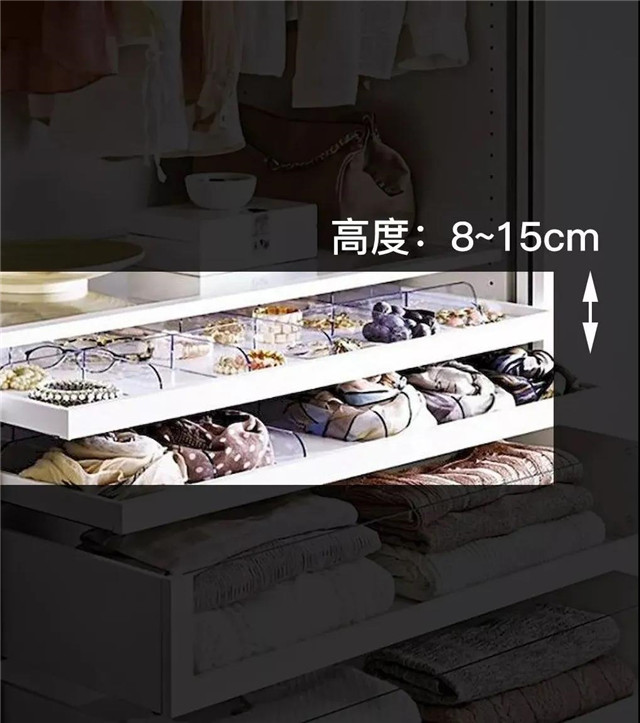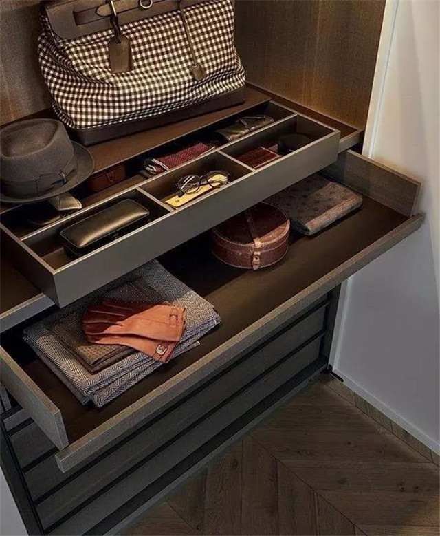 大致了解了空间布局,接下我们一起进入衣帽间室内看一看。为了供家人舒适的更衣,室内应分叠放区、杂物区、大件区和悬挂区等专用储藏空间。这么做是为了更好地打理,做好分区分类,合理利用空间,大大提高使用效率。